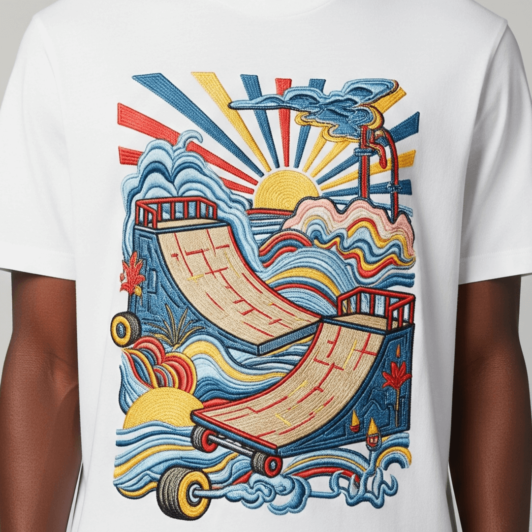 Roll into summer with this unique abstract embroidered t-shirt, perfect for skating enthusiasts and summer lovers alike. The design features dynamic abstract shapes and lines that subtly evoke skate ramps, wheels, and the summer sun. This tee offers a blend of artistic expression, luxury, and street style.